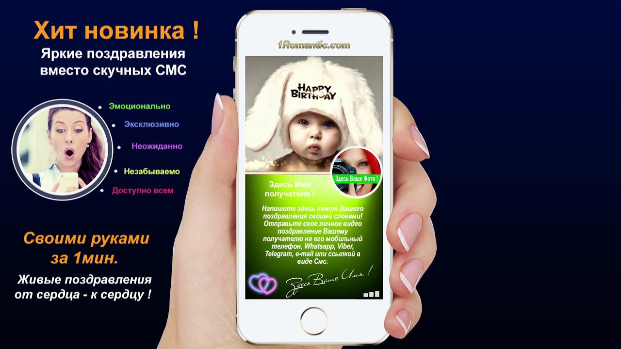 ЗАПОЛНИТЬ ЭТУ ОТКРЫТКУ СЕЙЧАС: https://1romantic.com/musicalnye-pozdravleniya/zabavny-zayka/ Дорогие друзья! Вам остаётся только, написать нужный вам текст и загрузить свою фотографию. 1Romantic.com Является первым и единственным в мире сервисом интерактивных видео поздравлений. Мы используем собственную уникальную технологию, добавляя ежедневно самые новые и последние разработки программирования. У нас Вы можете найти поздравления на любой вкус, только высокого качества и разрешения. Согласитесь, всегда приятней, отправить поздравления от себя лично, чем пересылать чужие, с уже заготовленным стандартным и быстро мерцающим текстом, как рекламный баннер, пересылаемый друг-другу от тысячи к тысячам где нет Ваших Имён. Задумайтесь ! Это выглядит слишком наивно и как минимум глупо, особенно для людей которые умеют писать и читать (на мою розочку сверкалку или стикер и отвали). Теперь всё будет иначе ! Вы можете сами передать своё настроение, тем людям, которым Вы будете адресовать своё поздравление. Теперь Вы сами, творец, художник и поэт своих чувств, наполняя видео открытку своими словами, излучая только самое доброе, искреннее из своих тёплых сердец. Загрузить свою любимую фотографию или фотографию получателя, что безусловно, будет гораздо приятней и неожиданней для него) Безусловно, мы подумали и о музыкальном оформление. Наверняка, Вы будете подбирать нужные слова и фотографию под ту песню, которую Вы захотите загрузить сами, а не ту которую Вам навязывают. Ну и самое главное, Вы можете использовать функцию добавления своего голоса, программа сама наложит Ваш голос на начало загруженной песни. Поверьте это очень оригинально, особенно если Ваш друг не слышал Вас долгие годы. Такое поздравление можно сделать действительно за 30-60 сек. Но если Вы творческий человек, оно не отпустит Вас так быстро))) И Вы будете думать, сочинять, плакать, улыбаться, восхищаться, раскрыв в себе новые таланты... возможно это станет Вашим первым собственноручным творением . Удачи Вам ! С уважением, Ваши Романтики ! Краткий список предлагаемых нами поздравлений... Поздравления с днем рождения женщине. Поздравления с днем рождения мужчине. Поздравления с днем рождения другу. Поздравления с днем рождения подруге. Поздравления с днем рождения для детей. Поздравления с днем святого Валентина. Поздравления Папе. Поздравления с днем рождения Маме. Прикольные поздравления. Видео поздравления с днем рождения. Музыкальные поздравления с днем рождения. Слайд-шоу с днем рождения. и многое-многое другое.