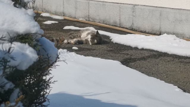 Кот #mimicat радуется зимнему солнцу, валяется на асфальте и нежится