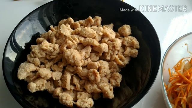 Рецепт 200 г соевого мяса 1 л. воды 2 луковицы 1 крупная морковь 5 ст. л. бальзамического уксуса 5 ст. л. соевого соуса 3 зубчика чеснока 1 ч. л. сахара соль по вкусу специи для блюд по корейски