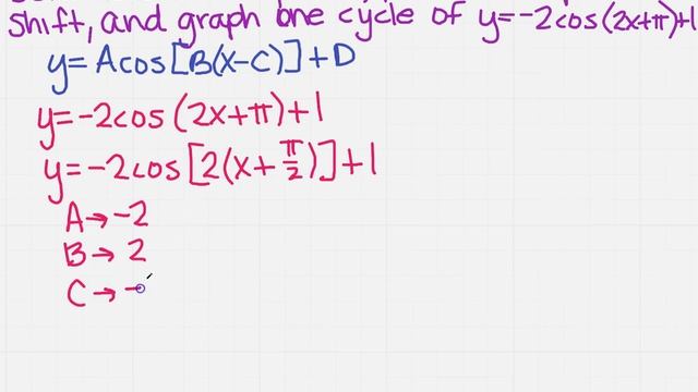 Learn how to find the amplitude, period and phase shift for the cosine function. NOTE: graphs are not drawn to scale. Please make sure to plot your points for accuracy.