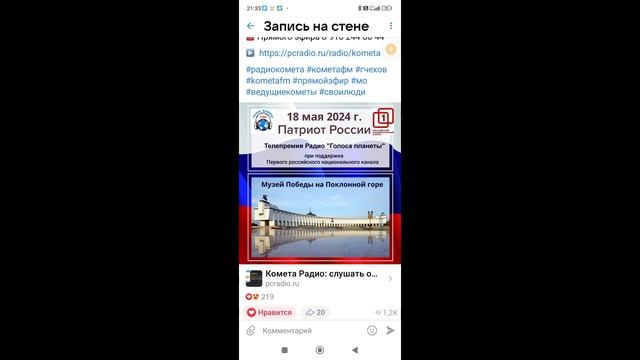 Радиостанция "Комета", передача "Свои люди", ведущая журналист Татьяна Афанасьева, гость в студии продюсер Ольга Алмазова с проектом телепремия "Патриот России", в этой программе звучит песня Инны Марухленко "Русские богатыри", в исполнении Владимира Морозова. 15 апреля 2024 года.