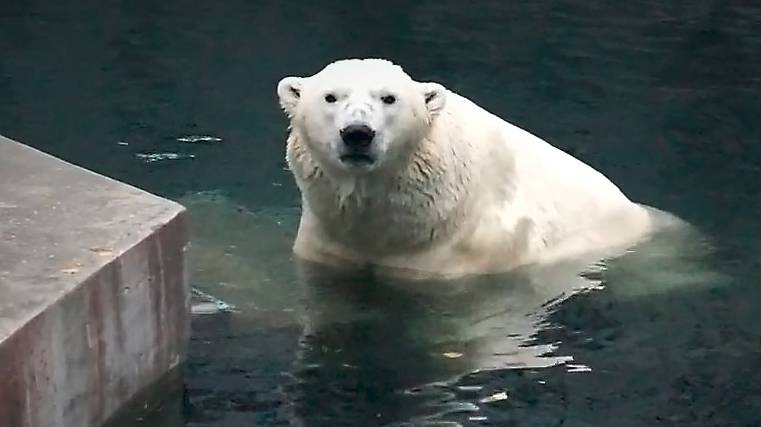 Белый медведь Кай плавает в чистой водичке, но тут принесли мясо.