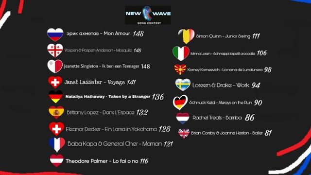 Результаты международного песенного конкурса Новая волна-25 в Омске Три победителя за 148 баллов: Jeanette Singleton - Мальта - Ik ben een Teenager Vospen & Pospen Anderson - Грузия - Mosquito Эрик Ахметов - Россия (страна-хозяйка) - Mon Amour Janet Lasseter - Швйецария - Voyage - 141 баллов Nataliya Hathaway - Германия - Taken by a Stranger - 136 баллов Brittany Lopez - Испания - Dans L'Espace - 132 баллов Eleanor Decker - Швейцария - Ein Lama in Yokohama - 128 баллов Baba Kapa & General Cher - Франция - Maman - 121 баллов Theodore Palmer - Австрия - Lo fai o no - 116 баллов Simon Quinn - Junior Swing - 111 баллов Minna Loren - Италия - Schnappi la petit crocodile - 106 баллов Korney Korneevich - Северная Македония - La nana de Lunalunera - 98 баллов Loreen & Drake - Швеция - Work - 94 баллов Schnuck Keldi - Германия - Always on the Run - 90 баллов Rachel Treats - Нидерланды - Bamba - 86 баллов Brian & Joanne - Великобритания - Baller - 81 баллов