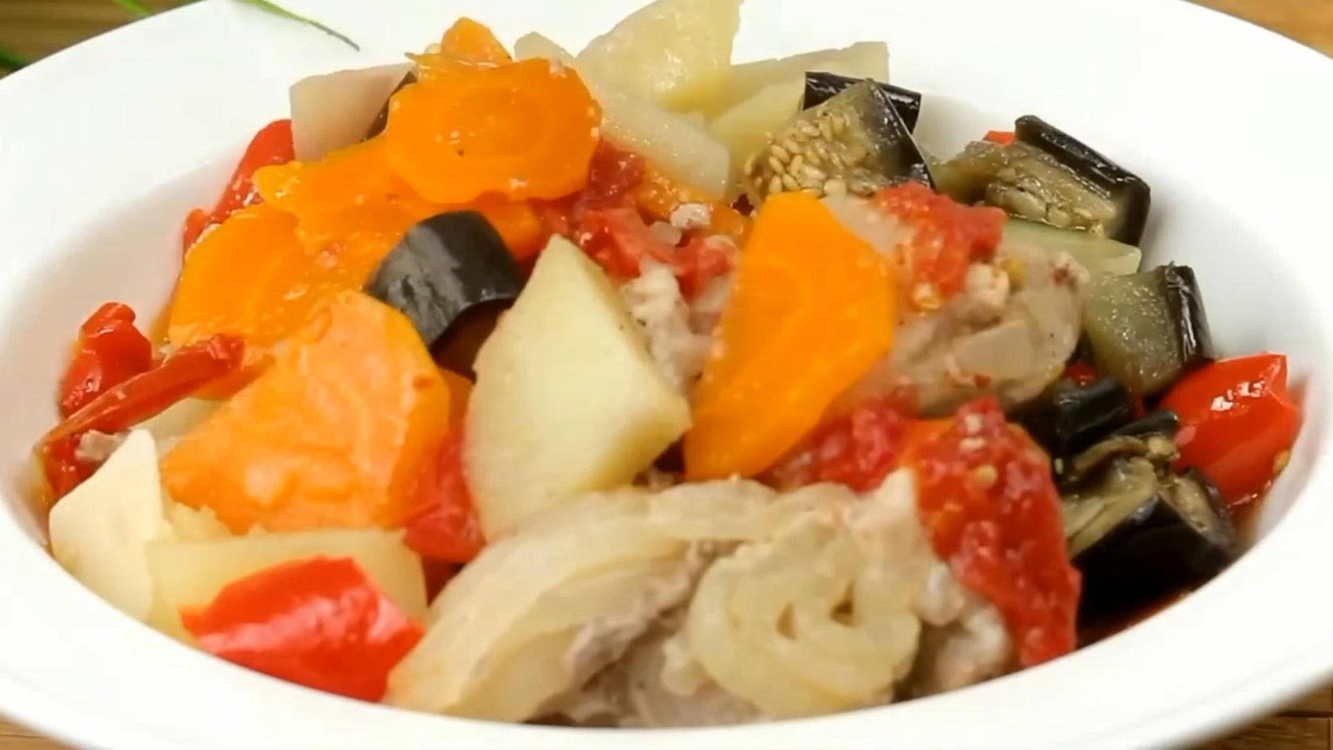 Рецепт: Растительное масло - 3 ст.л. Свинина - 600 г Соль Черный перец Лук - 2 шт Помидоры - 3 шт Морковь - 1 шт Сладкий перец - 1 шт Картофель - 400 г Баклажаны - 2 шт Чеснок - 2 зубчика