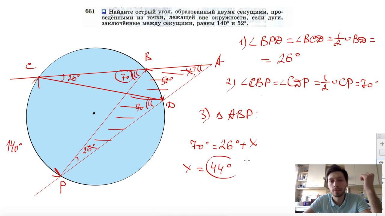 №661. Найдите острый угол, образованный двумя секущими, проведенными из точки, лежащей вне окружности, если дуги, заключенные между секущими, равны 140° и 52°. Поддержать канал рублём - 5469400944002125 (Сбербанк) Мой второй канал для подготовки к ЕГЭ и ОГЭ - https://www.youtube.com/ЕвгенийСумин Инстаграм - https://www.instagram.com/EGE_OGE.math Личный инстаграм - https://www.instagram.com/ee_sumin VK - https://vk.com/evgeniysumin FB - https://www.facebook.com/EvgeniySumin