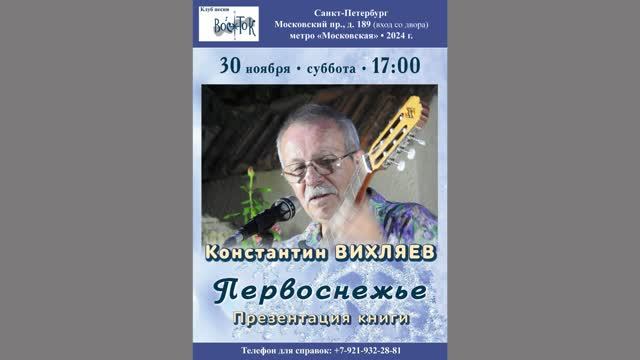 Константин Вихляев. Первоснежье. Презентация книги. Клуб песни «Восток». 30 ноября 2024 г. Видеозапись - Алла Левитан. Запись звука - Геннадий Демин. Афиша - Елена Адрианова. Санкт-Петербург, Московский пр., д. 189.