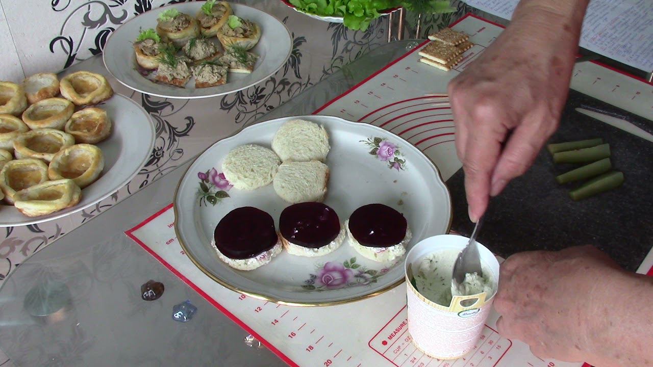 1)Грибы пожарить,у меня 500 гр на сливочном масле с растительным по 1 ст л.1 луковица,добавить соль,перец.прованские травы по вкусу,сливки 10% 5 сл л.-готово.разделить на 2 части.одна начинка готова,другую часть пробить блендером.это вторая начинка-грибной паштет,икра-готово Кусочек чёрного хлеба вырезать кружок,свеклу отварную, такой же кружочек .намазать хлеб сливочным сыром,а сверху кусочек селёдки,можно нанизать на шпажку маринованный огурчики ,перчик красный болгарский,у меня его не было. Авокадо разомнуть вилкой,лимонным соком сбрызнуть,намазать это на крекер,например,сверху лосось или форель.веточка укропа.из свежего огурца овощечисткой сделать слайсы,нанизать на шпажку с помидоркой черри.например. Печень трески разомнуть вилкой,и авакадо тоже,в волован сначала авокадо,потом печень трески и украсить кусочком авокадо и зеленью Перемешать авокадо с печенью трески и на маленькие кружки из слоёного теста,на них оливка.в её дырочку веточку укропа Оливки,помидоры нарезать маленькими кусочками.добавитьтунец филе .его размять вилкой и сбрызнуть лимоном,этот салатик уложить в валованы.украсить половинкой черри Салями,сыр.черри,перец.оливки,маслины,зелень-варианты различные