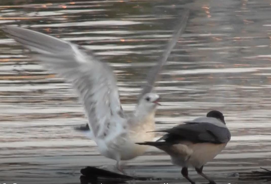 Серая ворона конфликтует с чайками за удобные места на берегу, 20.08.2022, Великий Новгород