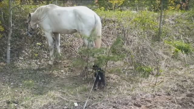 Цвергшнауцер Тоби. Знакомство с лошадкой.