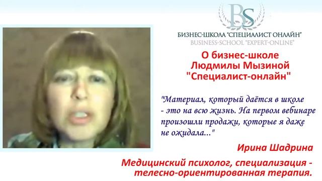 Мнение о бизнес-школе Л.Мызиной "СПЕЦИАЛИСТ ОНЛАЙН" выпускницы Ирины Шадриной