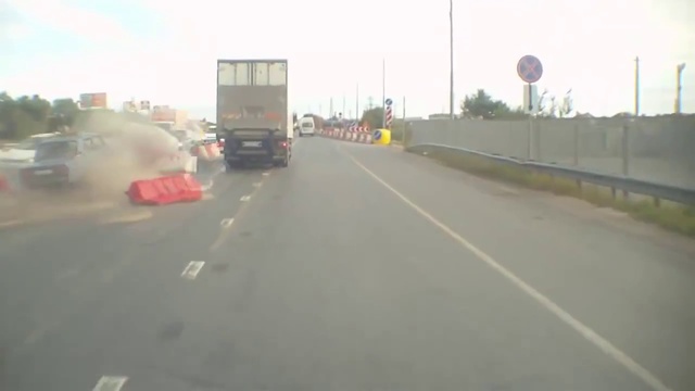 У водителя аквамаринового автомобиля ВАЗ-2107 случился ступор зрения. Не увидел пластиковых отбойников на сужении дороги. Хорошо, что они были наполнены водой, а не битумно-цементной смесью.