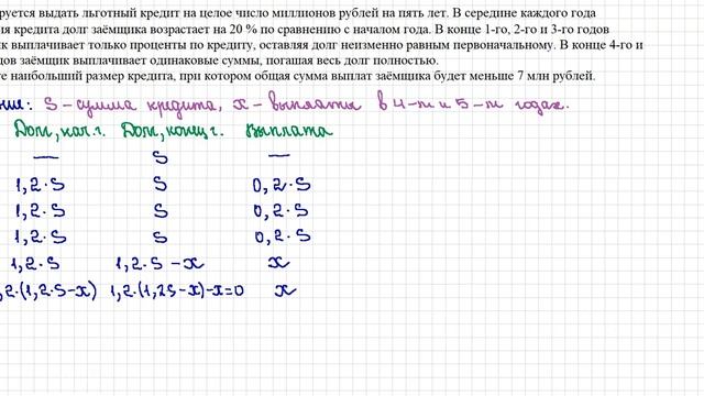 Планируется выдать льготный кредит на целое число миллионов рублей на пять лет. В середине каждого года действия кредита долг заёмщика возрастает на 20 % по сравнению с началом года. В конце 1-го, 2-го и 3-го годов заёмщик выплачивает только проценты по кредиту, оставляя долг неизменно равным первоначальному. В конце 4-го и 5-го годов заёмщик выплачивает одинаковые суммы, погашая весь долг полностью. Найдите наибольший размер кредита, при котором общая сумма выплат заёмщика будет меньше 7 млн рублей.