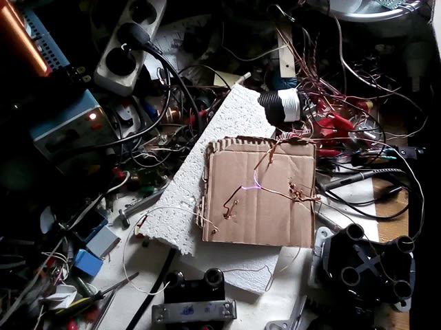 "Конденсатор потока". Высоковольтный разряд в форме буквы V. Используются две катушки зажигания и коммутатор зажигания от ВАЗа. Вместо датчика Холла - компьютерный вентилятор с 3-мя проводами. С одного источника высокого напряжения не получится добиться искры такой формы.