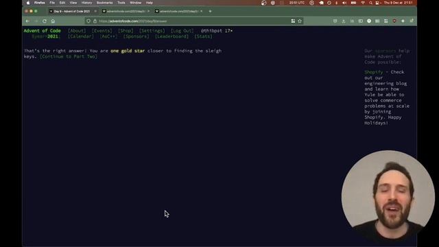 Advent of Code is a website that releases a new programming puzzle every day between the 1st and the 25th of December. You can get the problem statement there: https://adventofcode.com/2021/day/9 You can get the source code from this video on GitHub: https://github.com/tpatel/advent-of-code-2021/blob/main/day09.js Join our leaderboard by using the code 741576-8a5f62c5 on https://adventofcode.com/2020/leaderboard/private 0:00 Part 1 16:00 Part 2 Have fun! Subscribe to this channel: https://www.youtube.com/channel/UCsATdyu8fmu7B_-22AfySxg?sub_confirmation=1 ❤️ Read me on Twitter: https://twitter.com/thibpat