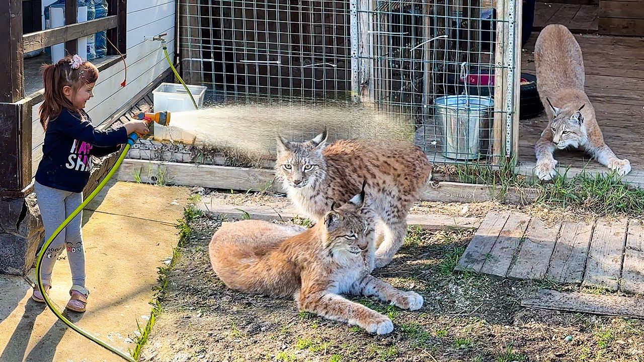 РЕАКЦИЯ ГИГАНТСКОГО МИНИПИГА И РЫСИ НА ДУШ / Бобкэт Руфус полюбил кресло