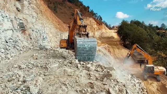 Powerful Excavator Cutting Stone _ Building New Mountain Road & Loading Heavy Dump Trucks