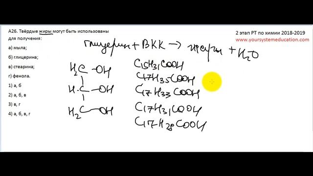Условие задания: Твёрдые жиры могут быть использованы для получения: а) мыла; б) глицерина; в) стеарина; г) фенола ... Станьте спонсором канала, и вы получите доступ к эксклюзивным бонусам: переходите по ссылке https://www.youtube.com/channel/UC528PPwgSGv3Qoh5o_qAY6A/join Видео-подготовка к ЦТ и ЕГЭ по химии http://www.yoursystemeducation.com Экспресс-подготовка к ЦТ и ЕГЭ по химии в контакте http://vk.com/club57816852 Репетитор по химии по скайпу https://vk.com/id30891697 (Александр Коньков) и a.alkhimikov (логин в Skype) Инстаграм без скучной теории https://www.instagram.com/yoursystemeducation/