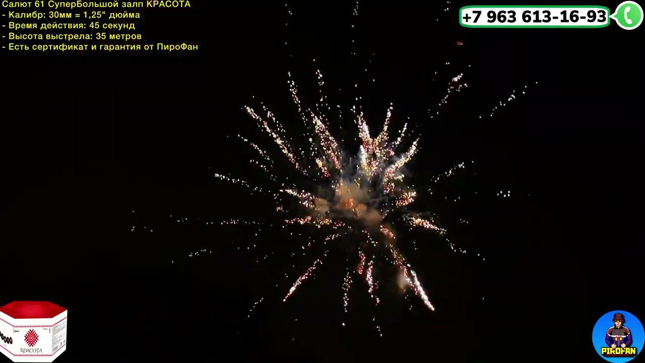 https://vk.com/market-133318175?w=product-133318175_6278145 - Успей купить со скидкой! TKPM3061 Салют 61 залп Красота - Калибр: 30мм = 1,25" дюйма - Время действия: 45 секунд - Высота выстрела: 35 метров - Есть сертификат и гарантия от ПироФан