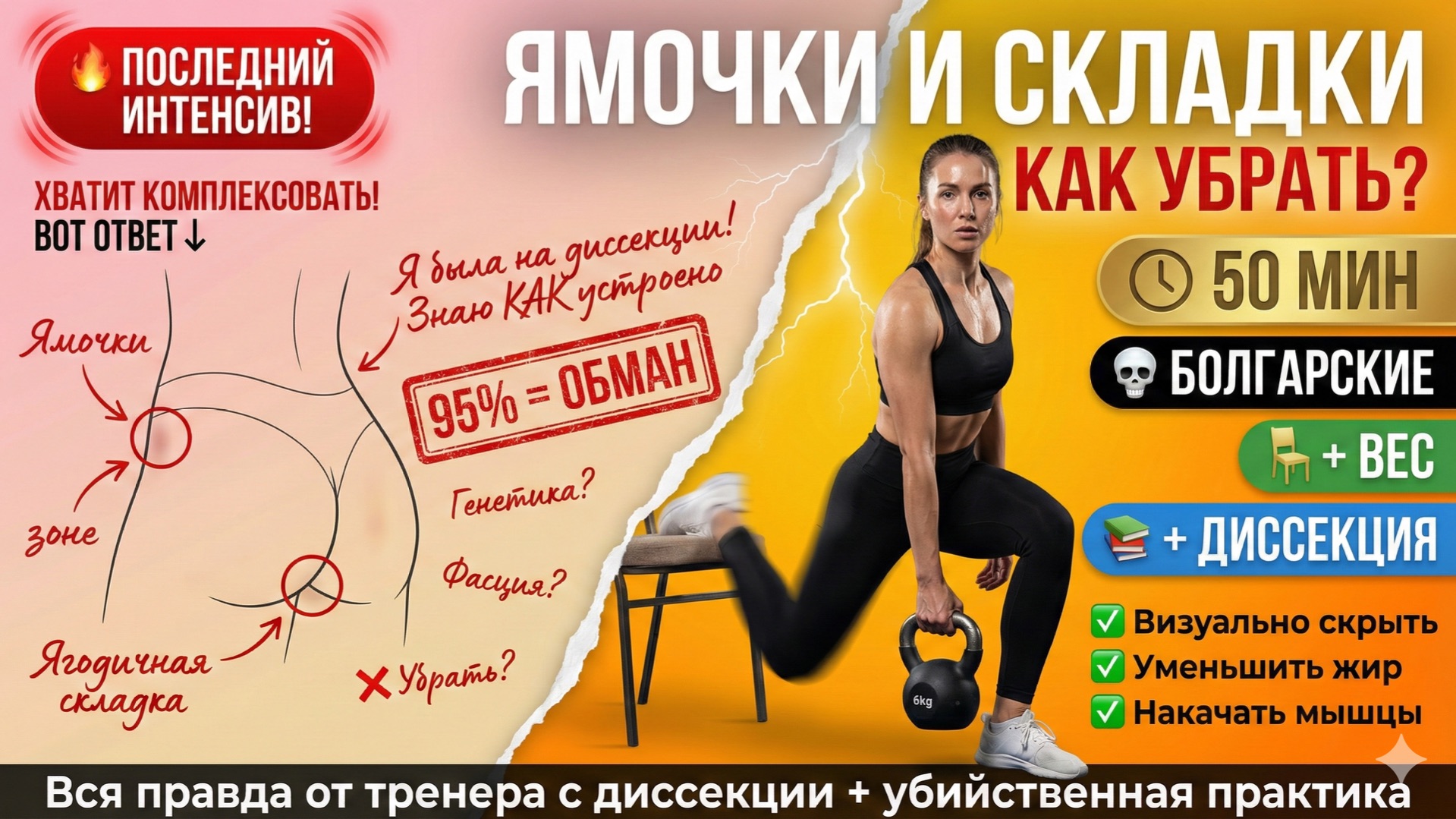 💣 ВСЯ ПРАВДА О ЯГОДИЦАХ - БЕЗ ВРАНЬЯ И МАРКЕТИНГА Развенчиваю главные мифы о ягодицах + показываю убийственную тренировку со стулом и весом. Честно про то, что можно изменить, а с чем придётся жить. Плюс анонс последнего интенсива "Бразильские ягодицы" - больше не повторится! ⚠️ В этом эфире я говорю то, что фитнес-маркетологи не хотят, чтобы вы знали! 🎁 БЕСПЛАТНО: 📚 Пробные тренировки с резинкой и весом 👉 https://babballet.com/trial/brazil?utm_source=youtube&utm_medium=video 🤖 AI-нутрициолог 👉 https://t.me/Eat_fit_reapit_babballetbot?start=id579554831 🔥 ЗАПИСАТЬСЯ НА ПОСЛЕДНИЙ ИНТЕНСИВ: 👉 https://babballet.com/trial/brazil?utm_source=youtube&utm_medium=video --- 🎯 ЧТО УЗНАЕШЬ (ТЕОРИЯ 22 МИН): МИФ 1: Ямочки на ягодицах по бокам ❌ **Что НЕ работает:** "Топовые упражнения от ямок" - фейк! МИФ 2: Подягодичные складочки ❌ **Ложные объяснения:** - "Это птоз (слабость мышц)" - "Это проблемы тазового дна" - "Карандаш под попу падает = птоз" 🏋️ ЧТО СДЕЛАЕМ (ПРАКТИКА 28 МИН): Оборудование: - Стул (обязательно!) - Вес: гантели, гиря, бутыль 5л (можно без веса первый раз) - Фитнес-резинка (желательно тугая!) Структура: РАЗМИНКА НА СТУЛЕ (5 мин) БЛОК 1: РУМЫНСКАЯ ТЯГА С ВЕСОМ (5 мин) БЛОК 2: ОТВЕДЕНИЯ БЁДЕР НА СТУЛЕ (3 мин) БЛОК 3: ПРИСЕДАНИЯ С ПУЛЬСАЦИЕЙ (4 мин) БЛОК 4: ПРИСЕДАНИЯ ПОДРЯД (3 мин) ФИНАЛ: БОЛГАРСКИЕ ВЫПАДЫ 💀 (8 мин) ЗАМИНКА (3 мин) 🔥 ПОСЛЕДНИЙ ИНТЕНСИВ С НАСТЕЙ: "БРАЗИЛЬСКИЕ ЯГОДИЦЫ И СИЛЬНЫЕ МЫШЦЫ" ⚠️ ЭТО ПОСЛЕДНИЙ ИНТЕНСИВ ВООБЩЕ! Не последний в году - ПОСЛЕДНИЙ В ПРИНЦИПЕ! Дальше я ухожу только в основную программу. Личной работы больше не будет. Если хотите индивидуального взаимодействия - это последний шанс! Что входит: Старт: Середина февраля 2025 Длительность: Целый МЕСЯЦ (раньше было 3 недели!) Тренировки: - 3 силовые в неделю (пн/ср/пт) - Короткие зарядки между силовыми (антиотёчные, суставные) - Разные направления: barre, 3D-фитнес, классика, растяжка, МФР - Разная длительность: 15 мин, 30 мин, 60 мин - Собственный вес + веса Питание: - Разбор ВСЕХ твоих тарелок лично мной - Рекомендации каждый день - Без выходных - Подстройка под цели Индивидуальная работа: - Полный диалог со мной в чате - Подбор тренировок под тебя - Подбор весов (с учётом возраста, особенностей) - Ответы на ВСЕ вопросы - Подкасты, аудио-разборы Фокус: - Ягодичные мышцы (большие, средние, малые) - Мышцы тазового дна - Сильные бёдра - Кровообращение в малом тазу - Снятие напряжения для сидячих - Визуал: целлюлит, ямочки, складки За месяц ты: РЕАЛЬНО получишь: ✅ Почувствуешь первый эффект ✅ Выберешь своё направление ✅ Сольёшь воду (антиотёчность) ✅ Улучшишь кожу (более гладкая) ✅ Начнёшь худеть ИЛИ набирать мышцы (под цель) ✅ Поймёшь, как тренироваться дальше ⏱️ ТАЙМКОДЫ: ТЕОРИЯ - МИФЫ О ЯГОДИЦАХ: 01:51 — Начало теории: топовые запросы и страхи 03:16 — МИФ 1: Ямочки на ягодицах по бокам 04:45 — Строение таза и вертлужная впадина 05:55 — Распределение жира: яблоко vs груша 06:33 — Что можно сделать: только визуал! 07:04 — МИФ 2: Подягодичные складочки 08:20 — История про диссекцию (труп!) 08:37 — Фасциальная структура - генетика 09:34 — Уникальность важнее шаблонов 09:56 — Хирургия не поможет (вырастет снова) 11:00 — Что работает: жир + мышцы = визуал 11:37 — Функции мышц и прогрессия нагрузки 12:06 — О маркетинге: 95% = обман! 12:37 — Как играют на тревоге женщин 13:02 — Эволюция и рептилоидная кора 14:11 — Тренировки для ЗДОРОВЬЯ, не для шаблонов АНОНС ИНТЕНСИВА: 14:43 — Переход к интенсиву 22:12 — Переход к тренировке! ПРАКТИКА - ТРЕНИРОВКА 28 МИН: РАЗМИНКА: 23:3