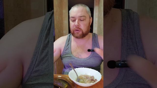 Ем на завтрак консервированное мясо цыпленка с солёными огурцами. Мукбанг. #мясоцыпленка #мукбанг