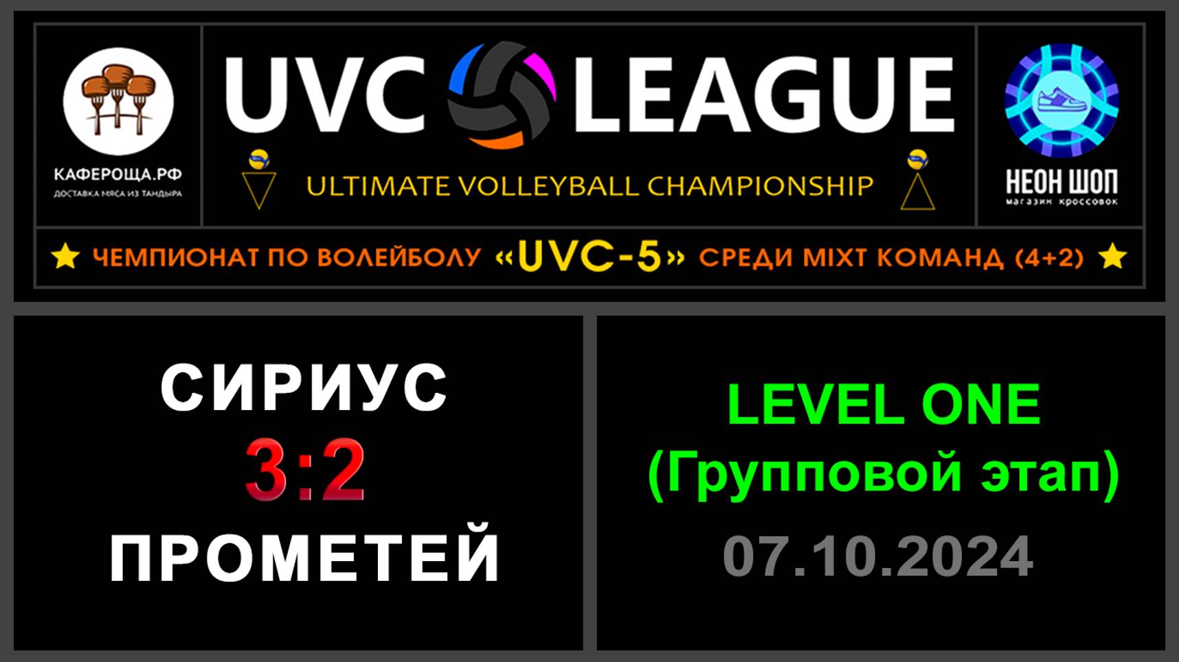UVC-5 (Mixt): Чемпионат UVC Лиги по волейболу среди MIXT команд (4+2), 2024-2025 гг. Результаты игры: LEVEL ONE (Групповой этап) 07.10.2024 Сириус - Прометей 3:2 (25:15, 20:25, 25:23, 25:27, 15:11) Comedy Club отдыхает, это не игра, а пособие по нелепым моментам в волейболе! Будут очень смешные видео! Если вернуться к спортивной составляющей, то игра была примерно равной, на тай-брейке Сириусу удался хороший отрыв на старте, который и сохранился до финального свистка. ✅Обе команды прошли в следующий этап конкурса «РЕШАЛА»! ⛔В конкурсе «Робин Гуд» точных попаданий не было! #UVC_ЛИГА_ЧЕМПИОНАТ_UVC_5_Mixt