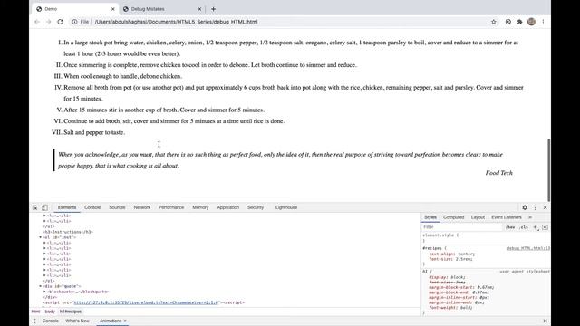 In This tutorial you will learn how to debug your HTML code in the Chrome Developer Tools. Developer tool comes in handy when you have mistakes in your code but do not notice it until displayed in a browser. Remember you can also use the developer tools to get ideas from other websites on the internet. This allows you to look at what markup the developers have used to create a content that is similar to the one you are trying to build for your own website. Please feel free to leave a comment on how this tutorial helped you learn something new. If you have any suggestions and would like me to deliver this tutorial in a different way please share that in the comment section and I will take that into consideration in the future tutorials.
