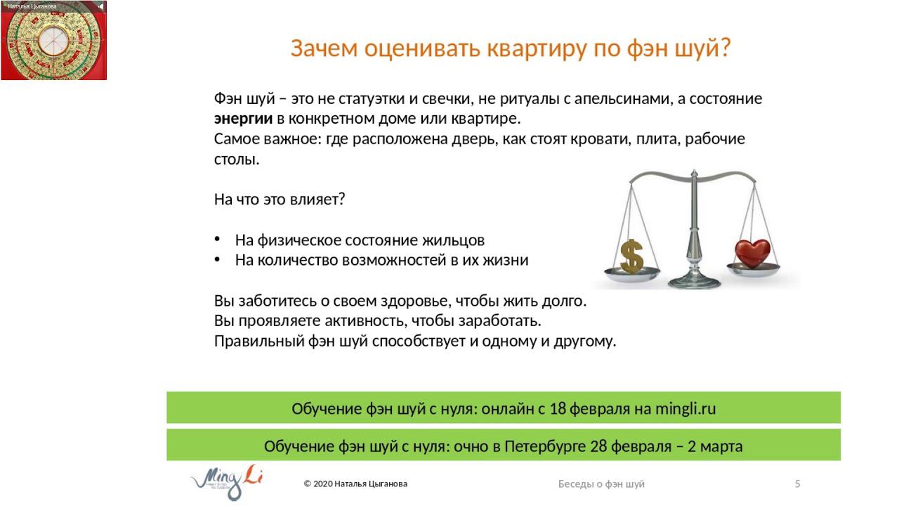 Программа ориентирована на практику – мы поможем вам разобраться с Фэн Шуй вашего дома и улучшить его настолько, насколько это возможно. Темы сегодняшней встречи: ● Насколько сложно оценить жилье по Фэн Шуй (и зачем это делать). Достаточно знать, где встает солнце, посмотреть на фото дома, план квартиры или же можно сразу на плане расставить активизаторы? Это будет разговор с теми, кто только недавно столкнулся с китайской метафизикой и имеет смутное представление о Фэн Шуй. ● Во второй части вебинара я покажу на конкретном примере, как быстро оценить помещение – стоит ли переезжать жить в квартиру или по-прежнему сдавать ее в аренду. И эта часть уже будет интересна практикующим. Начинающим может быть немного сложновато, но не пугайтесь - на программе мы начинаем с простых вещей и учимся делать аудит пошагово. Здесь вы уже видите, в некотором смысле "мастер-класс" ● Заодно расскажу о программе обучения, которая стартует в ближайшее время. Программу «Фэн шуй Пространство, работающее на вас» мы проводим с 2012 года; за это время на ней отучилось более 400 человек. Хотите научиться анализировать энергии пространства - приходите! На вопросы участников отвечала автор и преподаватель сайта mingli.ru Наталья Цыганова. С другими семинарами курса Фэн Шуй вы можете ознакомится на странице http://www.mingli.ru/school/item-cource/fs_online