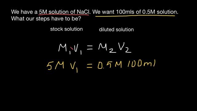 In the world of scientific research and experimentation, accurate and precise measurements are of paramount importance. One common task that scientists encounter in the laboratory is the process of dilution. Dilutions involve the careful manipulation of concentrations to achieve desired volumes and concentrations for experimental purposes. This article aims to demystify the concept of lab dilutions and provide a step-by-step guide for achieving accurate and reproducible results. Understanding Dilutions Dilution is the process of reducing the concentration of a solute by adding a solvent, typically water. It is often necessary to dilute stock solutions to obtain working solutions with lower concentrations suitable for specific experiments or analyses. Dilutions are governed by the dilution equation, C1V1 = C2V2, which relates the initial concentration (C1) and volume (V1) to the final concentration (C2) and volume (V2). Step-by-Step Guide to Lab Dilutions Determine the Desired Concentration and Volume: Clearly define the target concentration and volume needed for your experiment. This information will serve as the basis for calculating the necessary dilution. Prepare the Dilution Equation: Using the dilution equation (C1V1 = C2V2), plug in the values you know: the initial concentration (C1), initial volume (V1), and the desired final concentration (C2) or final volume (V2). Solve for the Unknown Variable: Calculate the value of the unknown variable (V1 or V2) by rearranging the dilution equation. If diluting a stock solution, solve for the initial volume (V1). If preparing a final solution, solve for the final volume (V2). Gather Necessary Materials: Prepare the required materials, including the stock solution, dilution container (such as a flask or tube), and a reliable pipette or measuring instrument for accurate volume transfer. Measure the Stock Solution: Carefully measure the calculated volume of the stock solution (V1) using the appropriate measuring instrument, ensuring precision and accuracy. Transfer the Stock Solution: Transfer the measured volume of the stock solution to the dilution container. It is crucial to minimize any loss during transfer to maintain the desired concentration. Add Solvent: After transferring the stock solution, add the appropriate volume of solvent, usually water, to achieve the desired final volume (V2). Mix the solution thoroughly to ensure homogeneity. Verify the Dilution: Double-check the final concentration and volume of the diluted solution, ensuring they match the desired values. If necessary, adjust the concentration or volume by repeating the dilution process. Conclusion Mastering lab dilutions is an essential skill for scientists and researchers. Dilutions allow for precise control over concentration and volume, enabling accurate and reproducible experimental outcomes. By following a step-by-step approach, scientists can confidently prepare dilutions, ensuring the correct concentration and volume required for their experiments. Dilutions provide the flexibility to work with a range of concentrations and optimize experimental conditions. With practice and attention to detail, scientists can achieve reliable and consistent results through effective dilution techniques. We have a 5M solution of NaCl We want 100mls of 0.5M solution C1V1 =C2V2 ;5MxV1 =0.5Mx100ml V1 = (0.5M x 100ml)/5M V1 = 50ml/5 V1 = 10ml Add 10ml of 5M NaCl to a container and bring the volume to 100ml with water. Let’s work through an example of this together. I mentioned in a previous slide that a common stock solution in a lab is 5 molar NaCl. This would be our initial concentration. If we want 100 milliliters of 0.5 molar NaCl, 100 milliliters is our final volume and 0.5 molar is our final concentration. We can plug these values into the equation C1V1 equals C2V2, and solve for V1 by dividing both sides by 5 molar. The molar will cancel out and we will get 50milliliters divided by 5 which means our initia... https://www.youtube.com/watch?v=-zttcsJk3k8
