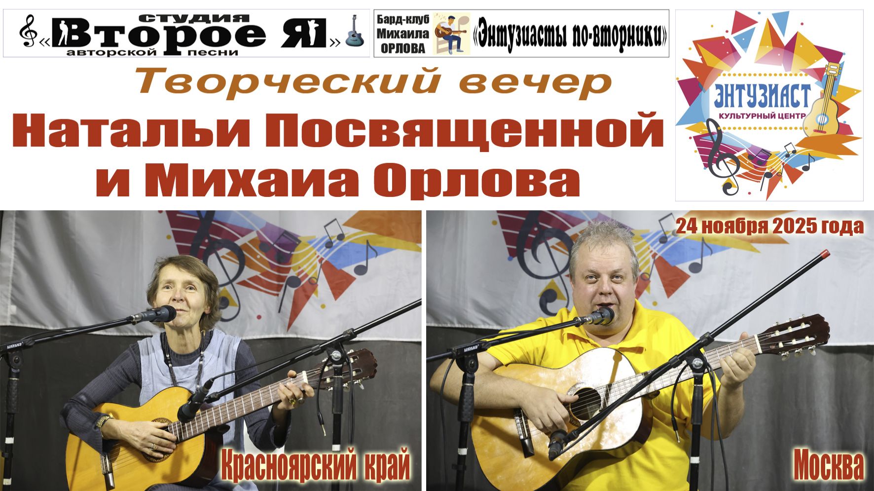 Участники: Наталья Посвященная, Михаил Орлов. Продолжительность – 54 минуты. Культурный центр ТСЖ Энтузиаст» под председательством Платона Толстикова: Москва, Шоссе Энтузиастов, дом 10/2 (метро «Площадь Ильича», «Римская»). 24 ноября 2025 года.