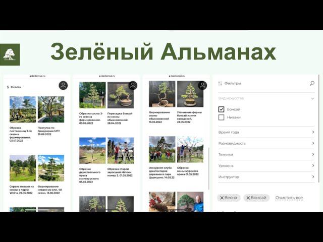 https://daobonsai.ru/almanac Обучающая видео-платформа, где формируется самая полная коллекция наших практических видео по созданию и содержанию бонсай, ниваки и художественной обрезке деревьев. Видео, снятых в нашем саду, на практических занятиях, в садах клиентов и питомниках. ✅Уже 85+ роликов ✅Регулярное пополнение коллекции ✅Каждый месяц - живой эфир ✅Удобная система поиска по каталогу: сезоны, виды деревьев, техники работы Деревья, адаптированные к нашему климату Подписка - от 983 руб/мес