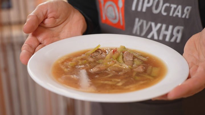 Простая кухня | Суп «Острый перчик» Рецепт: · Свинина - 300 г · Соевый соус - 3 ст. л. · Лук репчатый - 2 шт · Редька ("Дайкон") - 200 г · Бульон - 1 л · Паста перечная 1 ст. л. (или острый перец - по вкусу) · Чеснок- 1-2 зубка · Масло растительное - 1 ч. л.