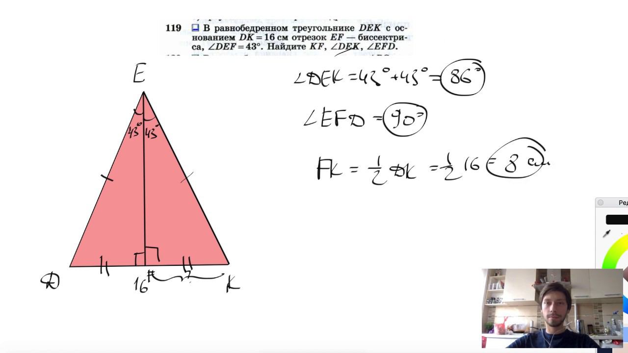 №119. В равнобедренном треугольнике DEK с основанием DK=16см отрезок EF— биссектриса, ∠DEF= 43°. Найдите KF, ∠DEK, ∠EFD. Поддержать канал рублём - 5469400944002125 (Сбербанк) Мой второй канал для подготовки к ЕГЭ и ОГЭ - https://www.youtube.com/ЕвгенийСумин Инстаграм - https://www.instagram.com/EGE_OGE.math Личный инстаграм - https://www.instagram.com/ee_sumin VK - https://vk.com/evgeniysumin FB - https://www.facebook.com/EvgeniySumin