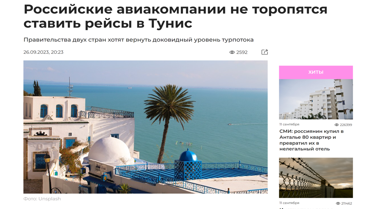 Новости туризма 26/09/2023 Российские авиакомпании не торопятся ставить рейсы в Тунис #туризм