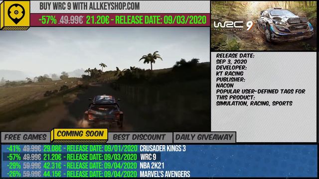 0:00 Free Games https://www.allkeyshop.com/blog/daily-deals/ 0:05 Coming Soon Games https://www.allkeyshop.com/blog/daily-deals/#Soon 0:12 Biggest Price Drop https://www.allkeyshop.com/blog/daily-deals/ 0:15 Best Discount https://www.allkeyshop.com/blog/daily-deals/ 0:20 Daily Giveaway https://www.allkeyshop.com/blog/reward-program/ 0:25 HITMAN https://www.allkeyshop.com/blog/daily-deals/ 0:45 SHADOWRUN COLLECTION https://www.allkeyshop.com/blog/daily-deals/ 1:05 The Dungeon Of Naheulbeuk: The Amulet Of Chaos https://www.allkeyshop.com/blog/buy-the-dungeon-of-naheulbeuk-the-amulet-of-chaos-cd-key-compare-prices/ 1:25 Sludge Life https://www.allkeyshop.com/blog/daily-deals/ 1:45 Crusader Kings 3 https://www.allkeyshop.com/blog/buy-crusader-kings-3-cd-key-compare-prices/ 2:05 WRC 9 https://www.allkeyshop.com/blog/buy-wrc-9-cd-key-compare-prices/ 2:25 NBA 2K21 https://www.allkeyshop.com/blog/buy-nba-2k21-cd-key-compare-prices/ 2:45 Marvel's Avengers https://www.allkeyshop.com/blog/buy-marvels-avengers-cd-key-compare-prices/ 3:05 Wasteland 3 https://www.allkeyshop.com/blog/buy-wasteland-3-cd-key-compare-prices/ 3:25 Gang Beasts https://www.allkeyshop.com/blog/buy-gang-beasts-cd-key-compare-prices/ 3:45 NieR:Automata https://www.allkeyshop.com/blog/buy-nier-automata-cd-key-compare-prices/ 4:05 Kenshi https://www.allkeyshop.com/blog/buy-kenshi-cd-key-compare-prices/ 4:25 Reward Program https://www.allkeyshop.com/blog/reward-program/ JOIN OUR DAILY GIVEAWAY : https://www.allkeyshop.com/blog/featured-gleam/ JOIN ALLKEYSHOPTV on our Twitch channel : https://www.twitch.tv/allkeyshop_tv/ COMPARE GAMES PRICES on our website: http://www.allkeyshop.com/blog/ JOIN OUR REWARD PROGRAM: https://www.allkeyshop.com/blog/rewar... Connect with ALLKEYSHOP on Social Media to interact with us! Instagram link:https://www.instagram.com/allkeyshop_... Facebook link: https://www.facebook.com/ALLKEYSHOPCOM/ Twitter: https://twitter.com/allkeyshop Youtube: https://www.youtube.com/user/allkeysh... Copyright Disclaimer Under Section 107 of the Copyright Act 1976, allowance is made for "fair use" for a purpose such as criticism, comment, NEWS REPORTING, teaching, scholarship, and research. Fair use is a use permitted by copyright statute that might otherwise be infringing. Non-profit, educational, or personal use tips the balance in favor of fair use. Part of the audios/videos belong to the rightful owner. NO COPYRIGHT INFRINGEMENT INTENDED "Our goal is to provide content that worth your time" #Allkeyshop #free #games #videogames #deals #discount #bestprice #pricecomparison