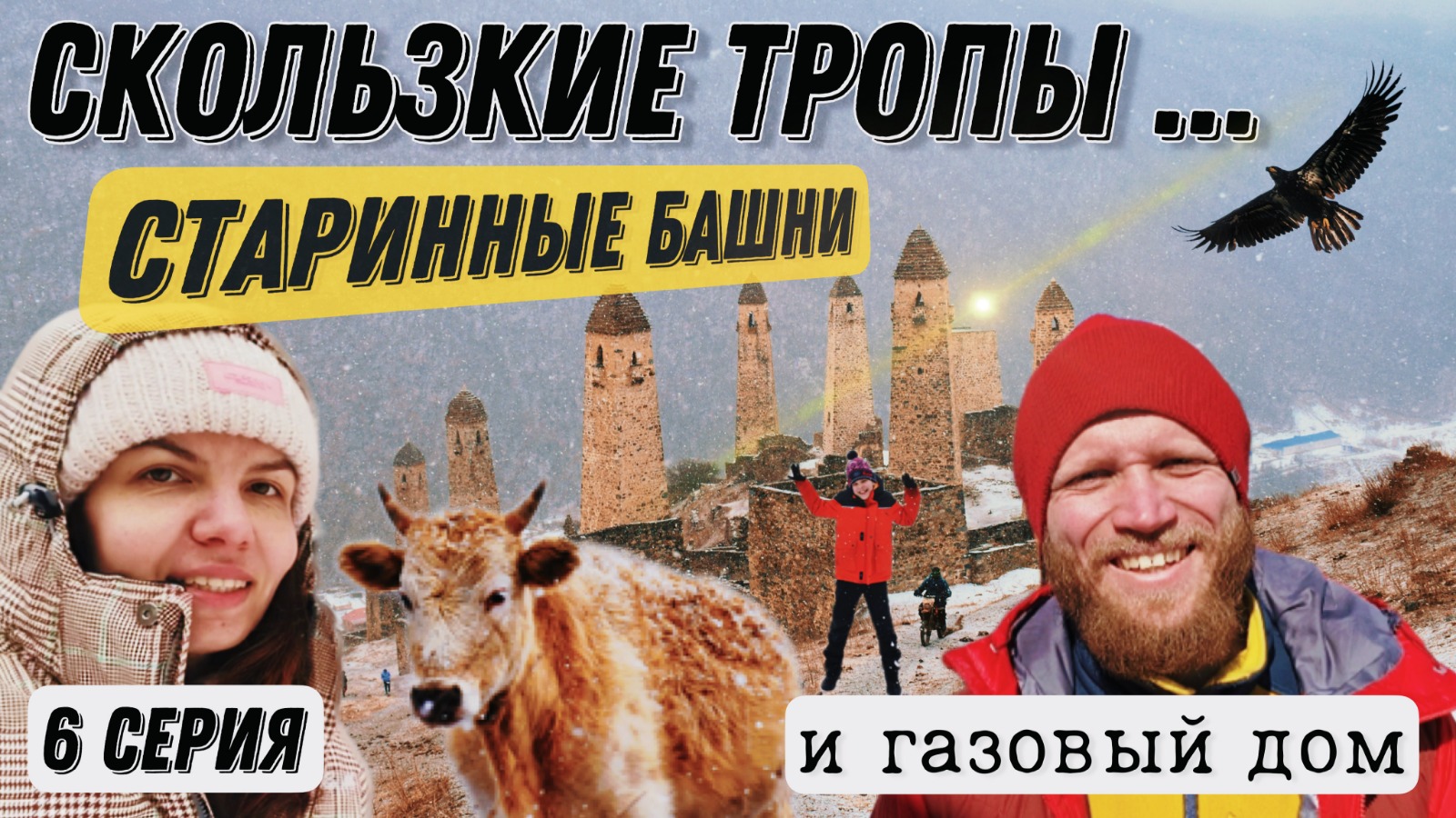 Показываем купленный ковер. Гуляем одни по горам. Поднимаемся к старинным башням. Прогуливаемся по тропе здоровья. Это было не легко! Смотрим, как жили предки - жилые и оборонительные башни. Спускаемся по скользким склонам. Машину сносит вниз по склону. Опасный серпантин. Гуляем по горам. Заселяемся в местный дом. Нечем дышать - весь дом в газу. Приводим дом в порядок. Обзор дома. Утренняя пробежка по горам Ингушетии. Красота! Снежные вершины, чистый горный воздух. Повсюду порят орлы. Довольные едем дальше... Поездка по Ингушетии на своем авто. Путешествуйте с нами по России и не только. Вдохновляйтесь на свои поездки Смотрите наши следующие серии! 2 чека. Кирилл и Наталья