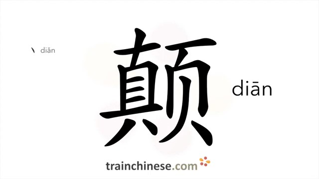 颠 (diān) upside down; summit; to jolt, bump; fall, go away; topple down