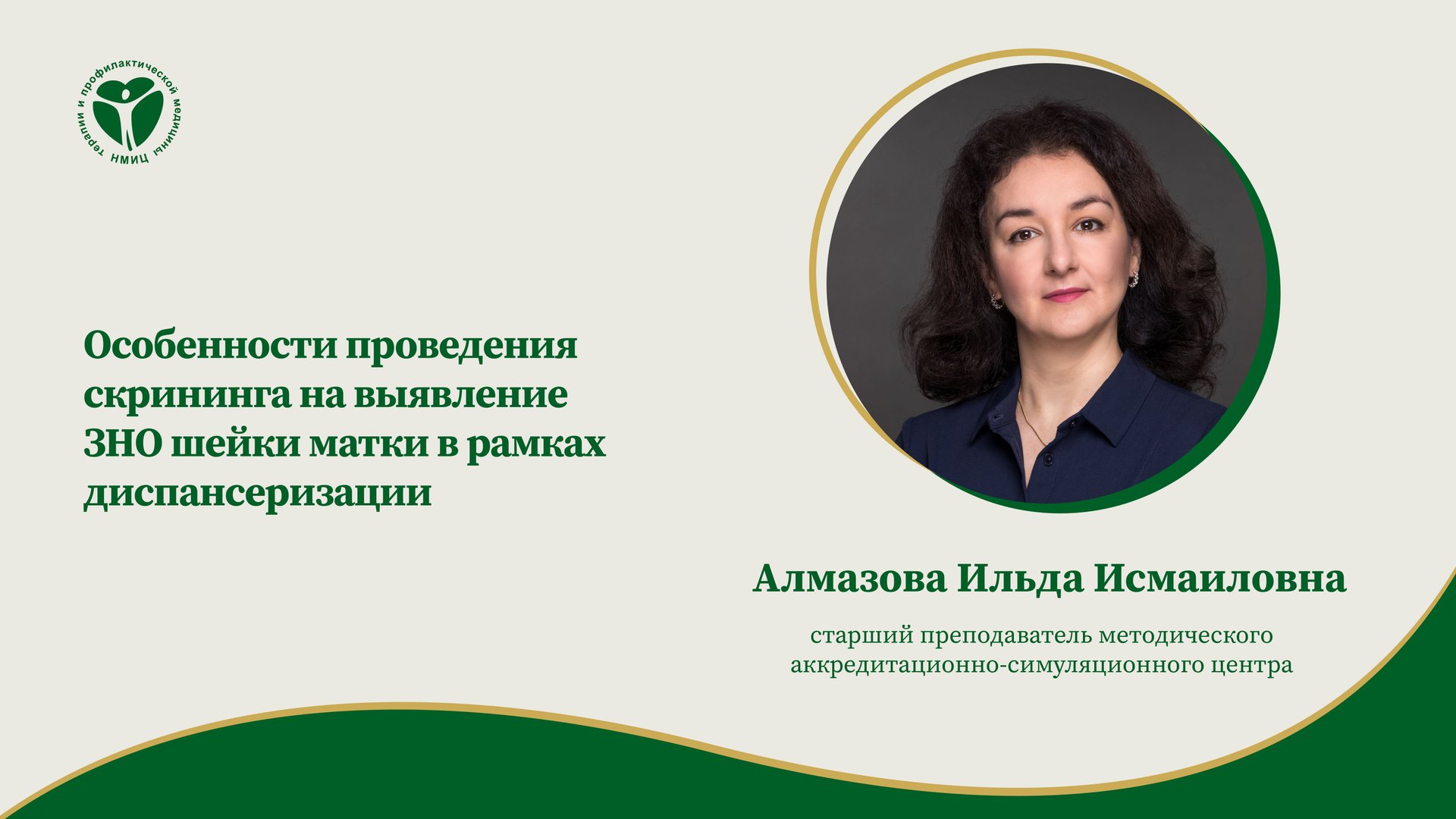 «Особенности проведения скрининга на выявление ЗНО шейки матки в рамках диспансеризации», семинар от 26.09.2023. Лектор: Алмазова Ильда Исмаиловна — старший преподаватель методического аккредитационно-симуляционного центра ФГБУ «НМИЦ ТПМ» Минздрава России