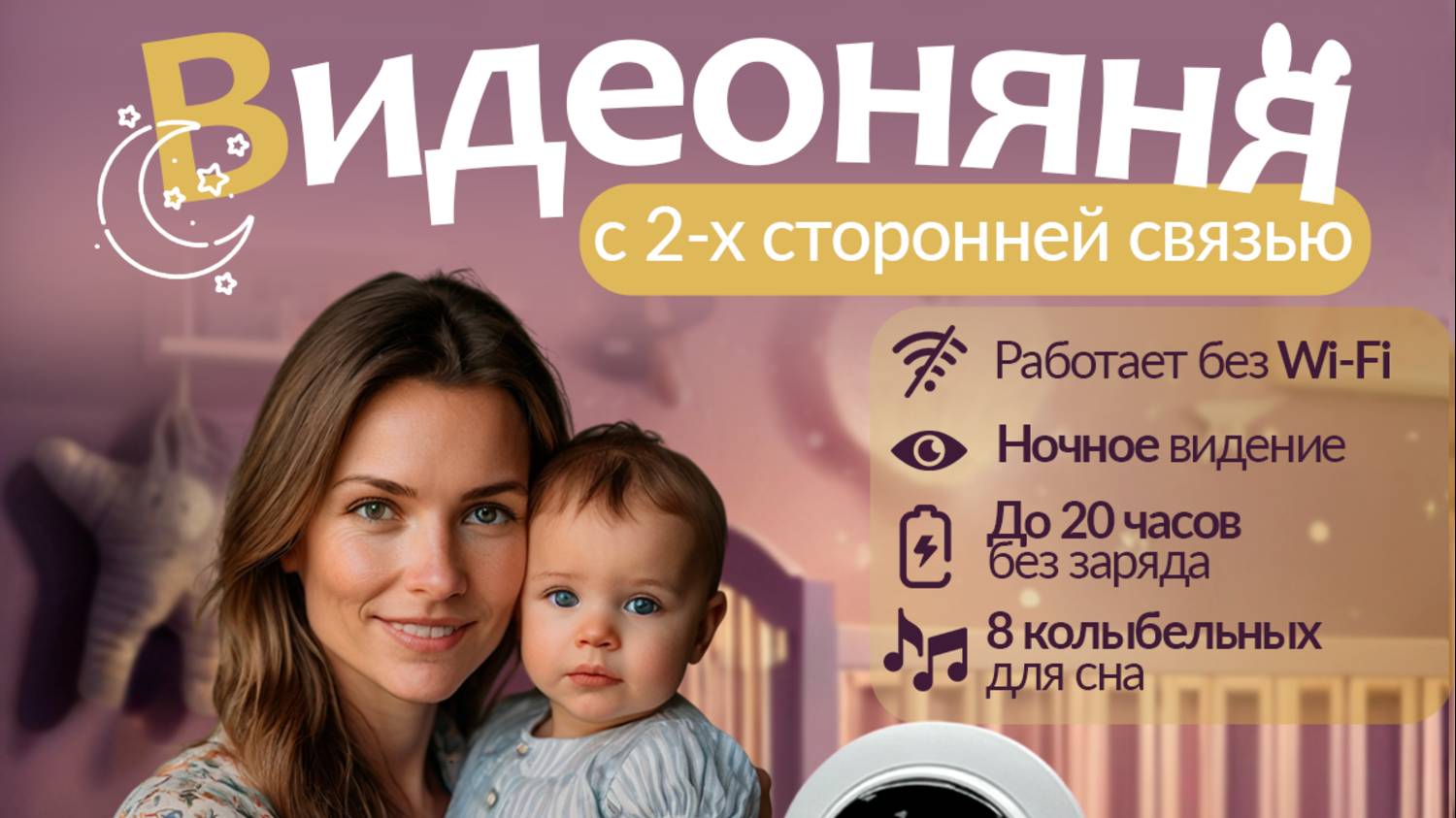 https://www.detmir.ru/product/index/id/6668349/ Детский мир артикул 1001047664 Видеоняня- это беспроводное устройство для малышей с ночным видением, состоящее из камеры и видеоэкрана. Камера видеонаблюдения для дома устанавливается в комнате ребенка и записывает в прямом эфире все происходящее в радиусе своего покрытия с передачей на экран маме. Радионяня существенно облегчает жизнь родителям. Скрытая камера видеонаблюдения позволяет наблюдать за ребенком из любой точки дома в радиусе до 50 метров, а на открытом воздухе 100 м. С мини камерой вы можете заниматься привычными делами по дому или по работе, отлучаться по необходимости и при этом не терять контроль над малышом. Современная видеоняня с монитором оснащена хорошей аудио и видео функцией ночного видения с инфракрасным датчиком. На экран монитора передаётся изображение высокой чёткости даже ночью. Двусторонний радиосигнал передаёт звук с камеры на родительский блок и обратно, позволяя малышу в любой момент услышать мамин голос. Камера видеонаблюдения wi-fi может воспроизвести 8 колыбельных мелодий, которые помогут успокоить и уложить малыша. Монитор с ЖК-дисплеем 2.8 дюйма имеет встроенный аккумулятор и работает до 20 часов, заряжается от сетевого адаптера или USB кабеля. Камера для съемки имеет детектор звука, которую можно использовать для дома. Родительский блок имеет встроенный аккумулятор и может работать без сети, камера работает от сети или с возможным подключением через power bank (внешний аккумулятор). Кабель имеет длину 2,45 м. Видео няня беспроводная работает без подключения к интернету и блютуз.