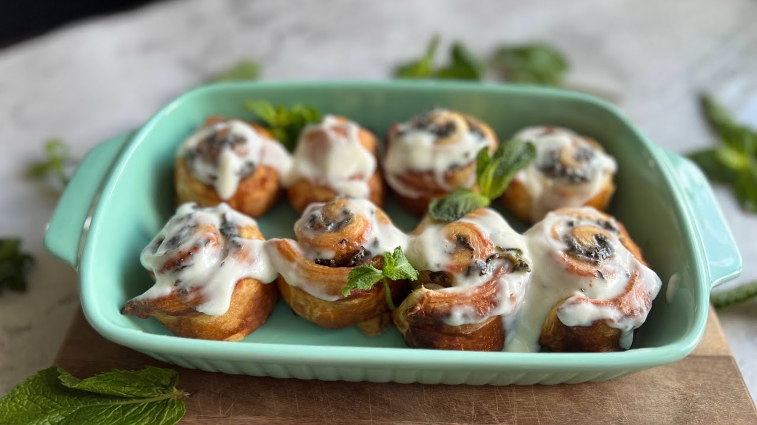 Выпечка летом прекрасна! Я тестирую разные рецепты выпечки и собираю для вас самые вкусные! Сегодня – синнабоны, да не простые, а с мятой. Мятные пряники мы уже готовили, мятный пирог на очереди) А пока давайте пробовать булочки! Вот такие интересные рецепты с мятой (оказывается, ее можно не только сушить) Что нужно: мята 50 г сахар 3 ст л сливочное масло 30 г корица 1 ч л слоеное тесто 250 г рикотта 2 ст л сах. пудра 2 ст л мука яйцо