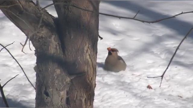 Свиристель настойчиво пытается проглотить целиком ранетку