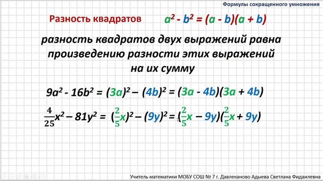 Разность квадратов. Формулы сокращённого умножения