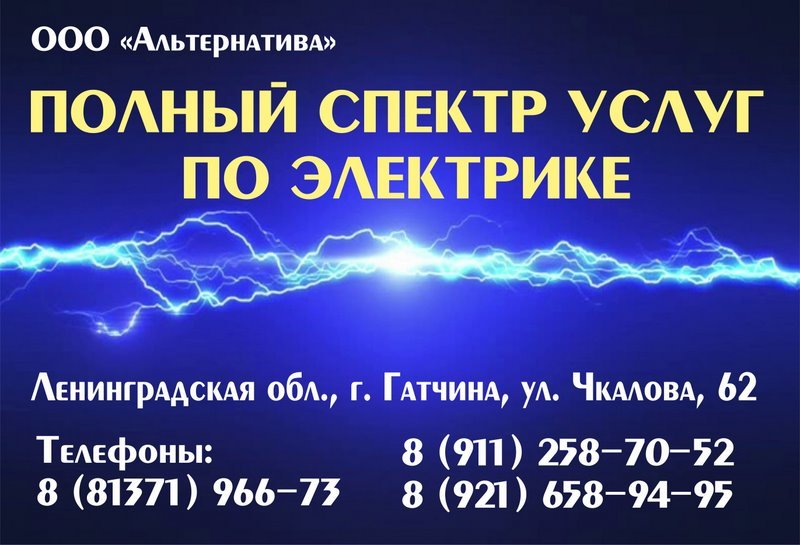 ООО "Альтернатива", электромонтаж в Гатчине и в Гатчинском районе. Услуги по электрике. Строительство (квартиры, коттеджи, загородные дома, садовые домики, бани, офисные и торговые помещения, детские сады, школы, рестораны, магазины, гаражи) Наша компания предоставляет полный спектр услуг по электрике. - Проектирование электроснабжения - Проведение пуско-наладочных и электромонтажных работ любой сложности на объектах: - жилищного строительства (квартиры, коттеджи, загородные дома, садовые домики, бани, и т.п.) - гражданского строительства (офисные и торговые помещения, хозблоки, детские сады, школы, рестораны, кафе, магазины, автомобильные стоянки, автозаправки, гаражи, и т.п.) - промышленного строительства (производственные здания, склады и т. д.) Проведение испытаний и измерений смонтированного оборудования. Мы предлагаем услуги не только на новых объектах строительства, но и при реконструкции и модернизации зданий, а также при устранении аварийных ситуаций. ООО "Альтернатива" является членом Саморегулируемых организаций НПО "Региональное проектное объединение", НПО "Региональное строительное объединение" и имеет соответствующие свидетельства на допуски к работам. Ленинградская область, Гатчинский район, г. Гатчина, ул. Чкалова, д. 62, территория завода "Энергоремонт". Тел.: 8 (81371) 9-66-73. Тел.: 8 (911) 258-70-52. Тел.: 8 (921) 658-94-95. В Интернете (в поисковиках) нас находят, в частности, по таким словам: электрика Гатчина, электромонтажные работы Гатчина, услуги по электрике Гатчина, проектирование электроснабжения Гатчина, электроснабжение Гатчина, пусконаладочные работы Гатчина, проведение электрики Гатчина, проведение испытаний оборудования Гатчина, проведение измерений оборудования Гатчина. #электрика #Гатчина #электромонтажныеработы #Гатчинскийрайон #Ленинградскаяобласть #электромонтаж #строительство
