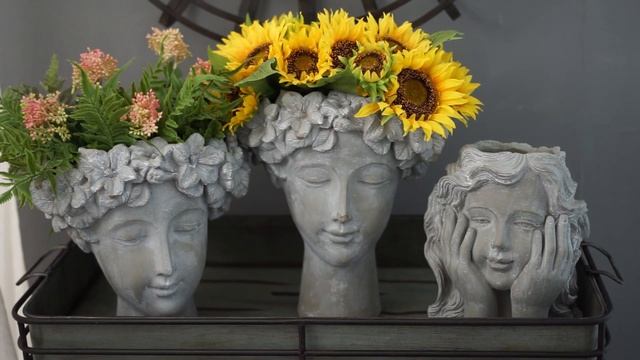 Кашпо в виде бюста задумчивой девушки, изготовленное из цемента, идеально подходит для внутреннего и наружного использования. Украсьте свой интерьер цветочной композицией, размещенной в этом изделии.