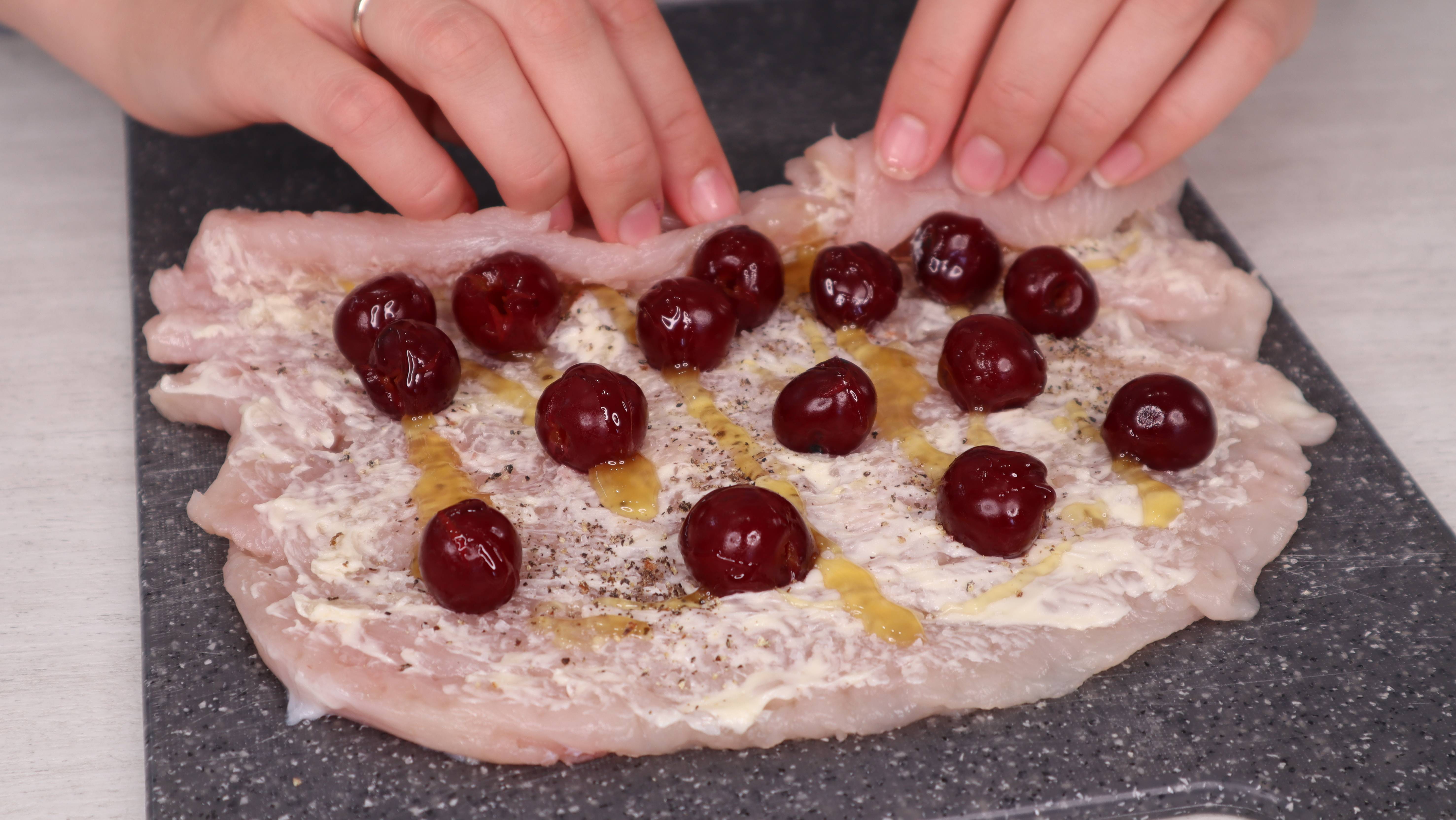 Заворачиваю вишню в куриное филе и отправляю в духовку! Как же это оказалось вкусно и сочно.