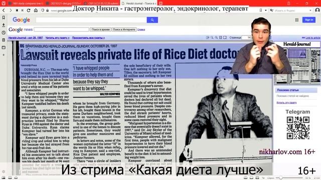 Лечебная рисовая диета. Рисовый доктор Уолтер Кемпнер. Высокоуглеводное низкожировое питание. Уолтер Кемпнер, известный как рисовый доктор, обнаружил, что диета с крайне низким содержанием белка, соли и жира способствовала выздоровлению пациентов с терминальной почечной недостаточностью. Рацион включал белый рис, фрукты без ограничений, фруктовые соки и чистый сахар, обеспечивая около 500 граммов углеводов в день. Эта высокоуглеводная диета также помогала при гипертонической болезни, ожирении и диабете 2 типа, способствовала снижению веса. Результаты противоречили распространённому мнению о необходимости сокращения углеводов для лечения диабета. Успех Доктор Кемпнера в лечении терминальной почечной недостаточности объясняется снижением нагрузки на почки за счёт исключения белка и соли, а не из-за высокого потребления углеводов. Чтобы обеспечить пациентов энергией без жиров и белков, он использовал углеводы в рамках его рисовой диеты. Однако диета Кемпнера имела особенности. Некоторых пациентов приходилось принуждать к её соблюдению, вплоть до физического воздействия. Такое питание было трудным для долгосрочного поддержания, и пациенты сами приносили плётки, чтобы не нарушать диету. Это указывало на высокий риск срывов. Рисовая диета доктора Кемпнера, по-видимому, влияла на психотическое поведение, обостряя его. Это могло быть причиной, по которой пациенты просили применять к ним строгие меры для соблюдения диеты. Рис для похудения, фруктовая диета, фруктовая диета для похудения, диета на углеводах. #ДиетаРисовая #ПочечнаяНедостаточность #ДокторКемпнер #ПитаниеВысокоуглеводное #ПоведениеПсихотическое ===== Информация в данном видео предоставлена для ознакомления и расширения кругозора. Не является призывом к действию, НЕ заменяет консультации вашего лечащего врача. По вопросам вашего здоровья и возможных действий проконсультируйтесь с вашим медицинским профессионалом. ===== dr nik, doctor nikita, dr nikita, doctor nik, никита харлов ▶️ Полная лекция: Самая эффективная диета: БезУГЛЕВОДная диета, КЕТО VS БезЖИРовая диета: физиология, исследования... https://www.youtube.com/watch?v=ytwRXuewAn4 📘 Самая лучшая диета для здоровья планеты! https://www.youtube.com/playlist?list=PLMLarg_xd_Mr7RWQkrZow-QzoJYvFJUNF ⭐️Углубленные лекции https://academy.nikharlov.com 🩸Новый канал Доктора Ника https://bit.ly/DrNikNew ✅ Консультации с доком Никитой https://nikharlov.com/consult/ 💎Сайт Доктор Ник https://nikharlov.com/ 💧Лекция ЭЛЕКТРОЛИТЫ https://bit.ly/Na-K-Cl ❗Лекция: Йод, Селен, Марганец, Глутатион https://bit.ly/OxSeIMnGS 🔑Лекция: Железо, Цинк, Медь, Витамин С https://bit.ly/CuFeZn-VitC ⭐️Лечебные лекции https://academy.nikharlov.com 💯Полезный телеграм https://bit.ly/TG-fat 💜Как помочь творчеству https://t.me/udothis/1305 🟠Лекция Вит. B1,2,3,5,6,7 https://bit.ly/EnergyVitsB 🔵Лекция МЕТИЛИРОВАНИЕ https://bit.ly/MethylatioN1k 🏆Поддержать творчество! https://bit.ly/joiN1k 💌Составить Биоценный ра