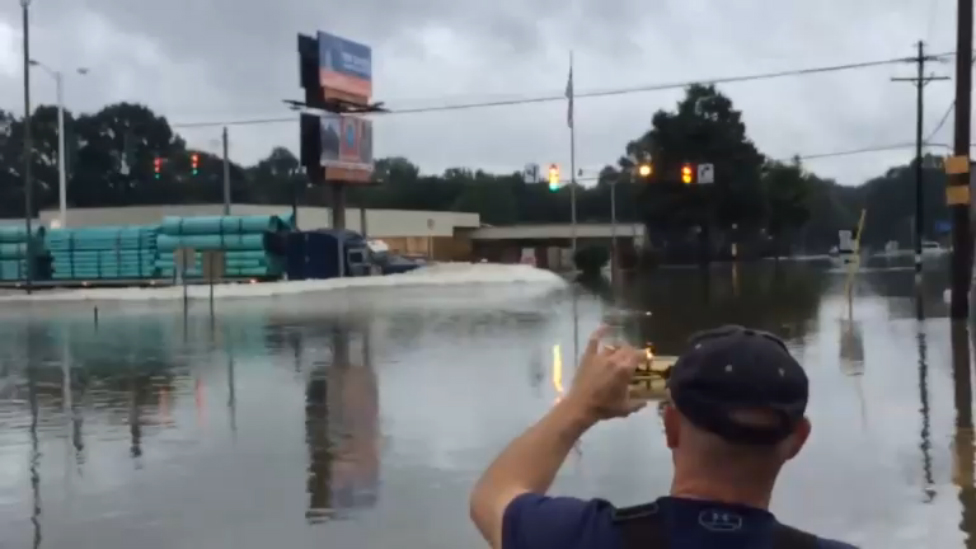 Видеозапись грузовика, который проезжает по затопленным после наводнения улицам города в штате Луизиана. Двое мужчин в лодке были явно удивлены происходящим.