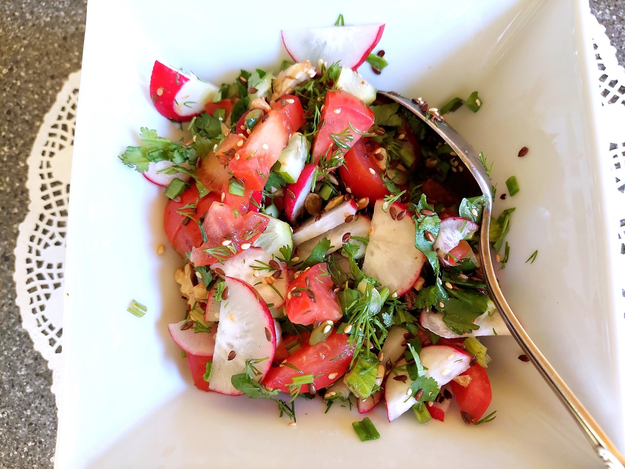 Салаты со свежими овощами частый гость в каждой семье и хочется каждый раз разнообразить его вкус. В данном салате обилие семян и орешек подчёркивает заправка из орехового масла. Оригинальный ореховый вкус доставит удовольствие. ИНГРЕДИЕНТЫ: • Редис – 3 шт • Огурец – 1 шт • Помидоры – 2 шт • Укроп – 1 вет • Лук зелёный – 1 шт • Кинза – 1 вет • Соль – по вкусу • Масло арахисовое – 2 стл • Орехово – семенная смесь – 2 стл Овощи и зелень нарезать в любом исполнении, добавить смесь орехово – семенную. В данном случае орехово – семенная смесь включает равные пропорции семян льна и кунжута; семечек подсолнечника и тыквы; орехи кедровые и грецкие. Посолить, заправить арахисовым маслом, перемешать. Переложить в салатницу. ПРИЯТНОГО АППЕТИТА!!! Всем мира, бодрости духа и благополучия.