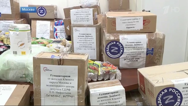 Сбор помощи организовала партия «Единая Россия», к акции присоединились муниципальные депутаты и жители столицы, в том числе те, кто сами когда-то бежали от обстрелов. В коробках самое необходимое. Это, конечно, продукты, которые могут долго храниться: крупы, мука, сахар, растительное масло. Медикаменты, перевязочные материалы и средства для обработки ран. Ну и еще трогательные детские рисунки со словами поддержки. Евгений Нифантьев, руководитель объединенного волонтерского центра партии «Единая Россия» в Москве, депутат Госдумы РФ: «У нас по всей Москве открыты вот такие вот небольшие пункты приема помощи от граждан, от наших сограждан, жителей Москвы. И вот сегодня мы отправим около тонны, которая была собрана буквально за неделю. И это такой маленький ручеек, такие ручейки идут на самом деле со всей страны и превращаются в такую большую широкую реку добра и такой вот взаимопомощи».