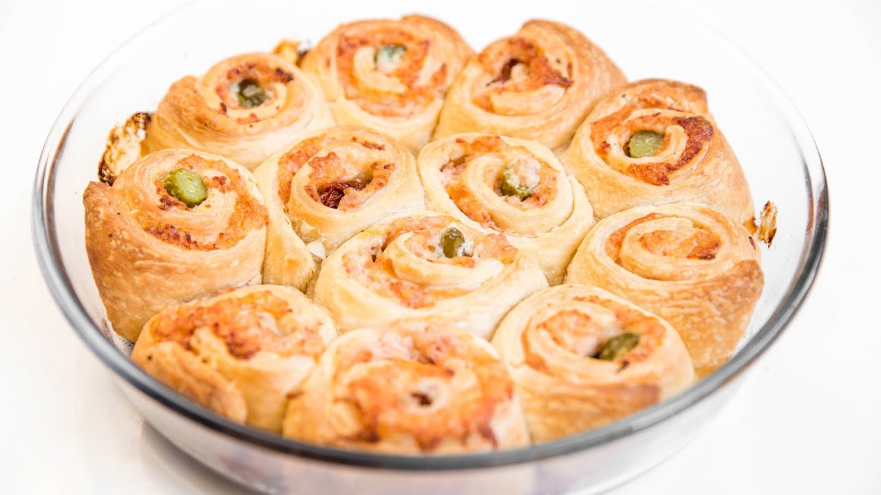 ✳️ ПИРОГ ИЗ РУЛЕТИКОВ С НАЧИНКОЙ Ингредиенты: - 2 листа слоеного дрожжевого теста (500гр) - 100гр сыра - 200гр колбасы - 2 ст.л. йогурта или сметаны - Сушеный или свежий чеснок - Маринованные огурцы - Перец халапеньо - Вяленые томаты Натираем сыр и колбасу, смешиваем, добавляем сметану, чеснок и перемешиваем. Тесто размораживаем и раскатываем в прямоугольник. Разрезаем тесто на полоски. Выкладываем начинку и добавляем ингредиенты на свой вкус. Я использовала маринованные огурцы, вяленые томаты и перец халапеньо. Сворачиваем рулетики, смазывая кончики полосок водой и выкладываем в форму для запекания. Запекаем в духовке 35-40 минут при 180 градусах.