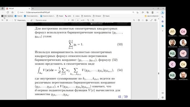 https://events.rudn.ru/event/222/ Вычислительные схемы решения квантовомеханических задач Чулуунбаатар Галмандах Аспирант кафедры Прикладной информатики и теории вероятностей, РУДН - Разработана и протестирована новая вычислительная схема непрерывной минимаксной оптимизации (вычисления локальных равновесий Нэша или минимаксных точек) нелинейных функционалов. - Проведена разработка, обоснование и тестирование эффективных вычислительных схем вариационного метода непрерывной минимаксной оптимизации c ограничениями по нелинейным параметрам пробных функций для больших и малых компонент решения уравнения Дирака для электрона в поле двух кулоновских зарядов тяжелых ионов и схем метода конечных элементов высокого порядка точности решения краевых задач для системы ОДУ второго порядка с применением современных компьютерных технологий. - Разработаны алгоритмы и комплекс программ построения полностью симметричных квадратурных формул p-го порядка на d-мерных симплексах с положительными весами и узлами внутри симплексов. - Представлены приложения разработанных вычислительных схем вариационного метода и метода конечных элементов для решения и анализа краевых задач атомной и молекулярной физики. - Выполнены высокоточные расчеты собственных значений энергии релятивистского электрона в кулоновском поле зарядов двух тяжелых ионов, и связанных и метастабильных состояний двухатомной молекулы бериллия. Computational schemes for solving quantum mechanical problems Chuluunbaatar Galmandakh Department of Applied Informatics and Probability Theory, RUDN University - A new computational scheme for continuous minimax optimization (computations of local Nash equilibria or minimax points) of nonlinear functionals has been developed. - The development, justification and testing of efficient computational schemes of variational method with continuous minimax optimization and constraints on nonlinear parameters of test functions for large and small components of the solution of the Dirac equation for an electron in the field of two Coulomb charges of heavy ions and computational finite element method schemes of high order accuracy for solving boundary value problems for a system of second-order ODEs was carried out using modern computer technologies. - Algorithms and computer program for calculation of full symmetric p-order quadrature formulas on d-dimensional simplexes with positive weights and nodes inside the simplexes are developed. - Applications of the developed computational schemes of the variational method and the finite element method for solving and analyzing of boundary value problems of atomic and molecular physics are presented. - High-precision calculations of the energy eigenvalues of a relativistic electron in the Coulomb field of charges of two heavy ions and bound and metastable states of two atomic beryllium molecules were conducted.
